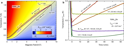 Thomas Gruner and colleagues in the QM group and at the MPI-CPfS in Dresden showed that YbNi2Sn retains high spin entropy down to very low temperatures, much less than 1K, despite being a good metal. On the face of it, this is unexpected, because electrons in metals form a degenerate Fermi gas, and so their entropy decreases linearly with temperature below a temperature scale that corresponds to the electronic bandwidth, usually much larger than room temperature. YbNi2Sn, like some other rare earth intermetallics generally classed as 'Kondo lattice materials', bucks this trend because of the tendency of local moments to be protected on the rare earth site. Because the spin entropy can be controlled by applying a magnetic field, YbNi2Sn is a great refrigerant for adiabatic demagnetisation cooling in the sub-Kelvin range. It is relatively cheap to produce, UHV-bakeable and has high thermal conductivity, which makes it easey to conduct heat in or out. Read more about it in Comm. Materials 5, 63 (2024)
